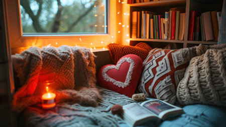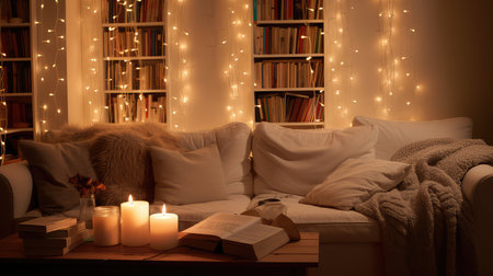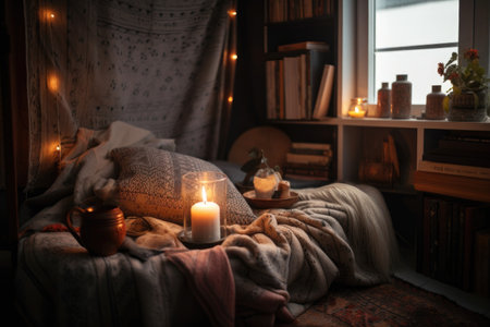 cozy reading nook surrounded by cozy throw blankets, scented candles, and a plate of snacks, created with generative ai