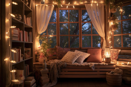 whimsical fairy lights and lanterns illuminating a cozy reading nook, created with generative ai
