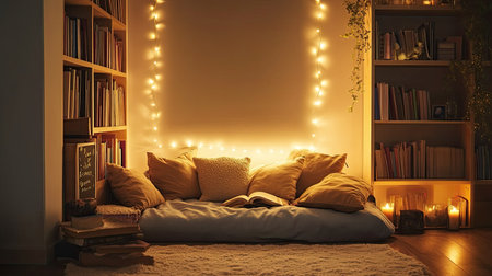 Peaceful reading nook with cushions, books, and soft lighting