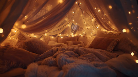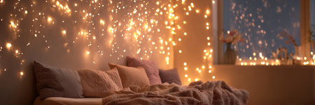 A cozy bedroom bathed in the soft glow of fairy lights, creating a dreamy and enchanting atmosphere for relaxation and restful sleep.