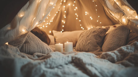 This image portrays a cozy indoor tent setup featuring soft cushions and glowing fairy lights, creating a warm and inviting atmosphere perfect for relaxation.
