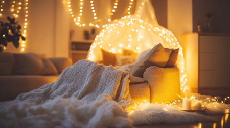 This image showcases a cozy living room adorned with warm lights and soft textures, inviting a sense of comfort and tranquility ideal for relaxation.