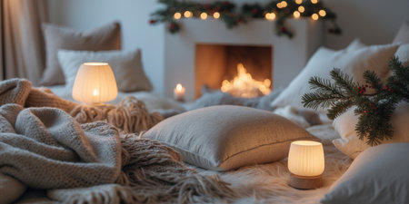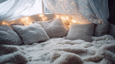This inviting indoor scene features a cozy arrangement of fluffy blankets and decorative pillows, softly illuminated by warm lights, creating a perfect retreat.