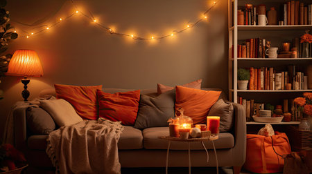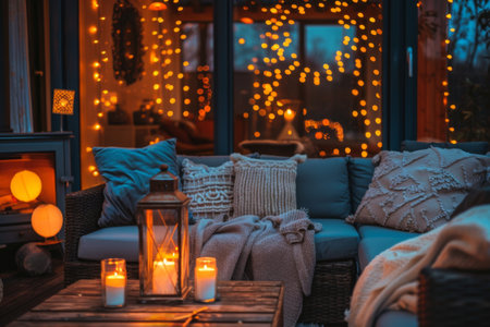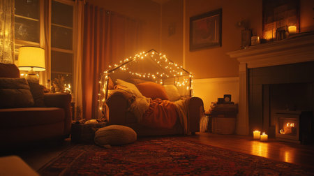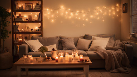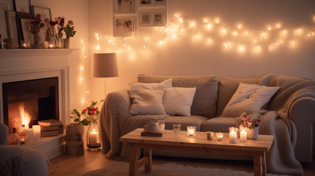 This inviting living room scene features soft lighting from fairy lights and candles, creating a warm and cozy atmosphere perfect for relaxation and gatherings.