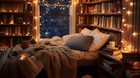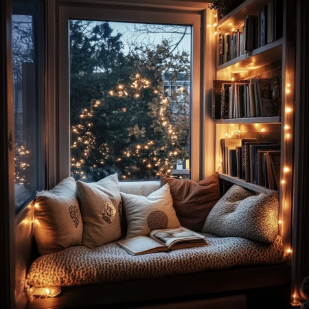 Cozy nook warm lights pillows and mug of tea atmosphere.