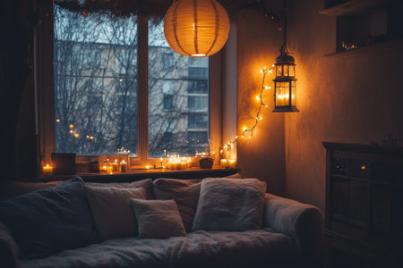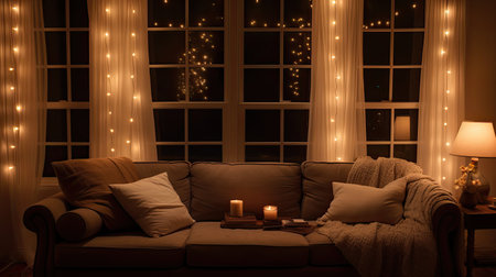 Interior living room with warm lighting and winter atmosphere