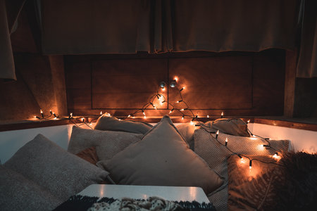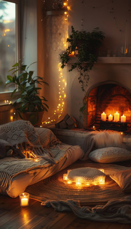 Soft textiles and fairy lights illuminate a cozy living room, offering a warm retreat on a chilly evening with comfortable cushions and blankets.