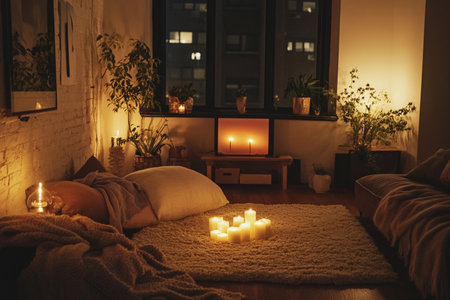 Cozy Evening Meditation Setup with Candles and Soft Lights for Relaxation and Comfort
