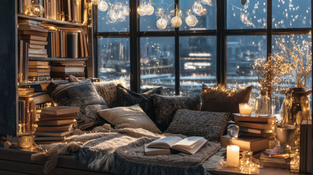 A snug, twinkling reading corner piled with tomes ideal for evoking tranquility, dreaminess, or cozy vibes.