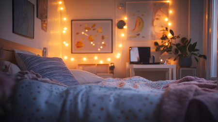 A warm and inviting bedroom scene with twinkling lights, decorative art, and comfortable bedding. Perfect for conveying relaxation and tranquility.