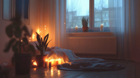 A warm and inviting indoor space featuring soft blankets, plants, and flickering candles, perfect for creating a tranquil atmosphere in the evening.