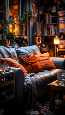 Cozy Living Room Ambiance with Soft Lighting and Inviting Decor for Relaxation and Comfort