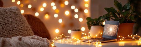 Cozy working space illuminated by warm glowing fairy lights, creating atmosphere for work or relax
