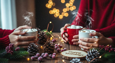 Two people holding mugs of hot chocolate with marshmallows, surrounded by pine cones and festive decorations, warm holiday atmosphere