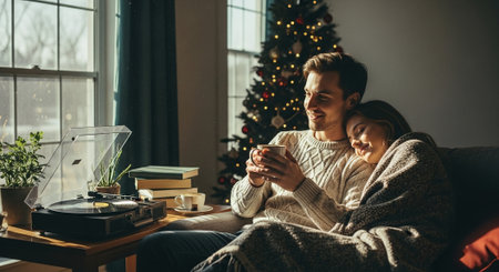 A cozy living room scene with a couple sitting together on a sofa, enjoying warm drinks, a decorated Christmas tree in the background, soft lighting, and a coffee table with pastries and books