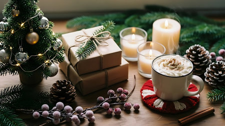 A cozy holiday scene featuring a mug of hot chocolate topped with whipped cream, surrounded by pine cones, red berries, and a beautifully wrapped gift, with soft bokeh lights in the background