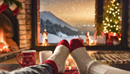 A cozy Christmas scene featuring knitted stockings hung by a fireplace, decorated with ornaments and a gift box, with a festive mug of hot chocolate