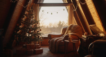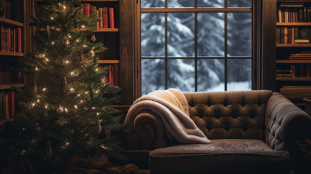 cozy Christmas scene with a decorated tree, a comfortable armchair, and a snowy view from the window, creating a warm and festive atmosphere.High resolution AI generated