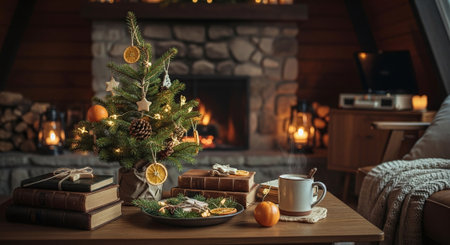 A cozy living room scene with a comfortable armchair, a small decorated Christmas tree, and a coffee table set with cookies, tangerines, and a mug of hot chocolate topped with whipped cream