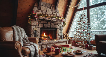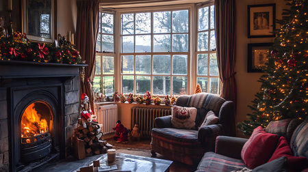 A living room interior is depicted with Christmas decorations. The room features a fireplace, a Christmas tree, and window views. Colors include greens, browns, and reds creating a warm atmosphere. The scene suggests festive celebrations, suitable for commercial or editorial applications related to holidays or home decor.