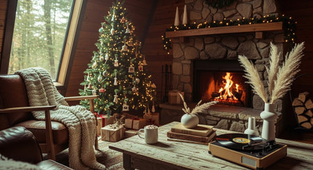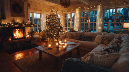 Experience the warmth of a cozy winter living room adorned with a beautifully decorated Christmas tree, inviting fireplace, and scenic view. Ideal for holiday inspiration.