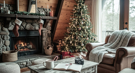 A warm inviting scene of a rustic cabin adorned with stockings perfect for winter gatherings.