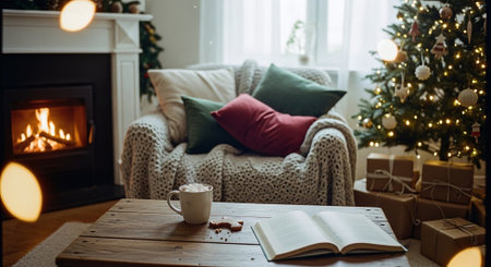 A cozy living room scene with a warm fireplace, a comfortable chair with cushions, a coffee mug on a wooden table, an open book, and a decorated Christmas tree in the background
