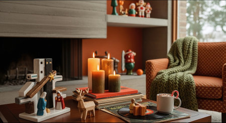 A cozy living room scene decorated for the holidays, featuring candles, a nativity scene, and festive ornaments
