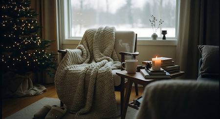 A cozy holiday reading nook features a comfortable armchair draped with a knitted blanket and festive pillows next to a lit Christmas tree. A stack of books, a candle, and a mug of hot cocoa on the side table complete the warm winter atmosphere.