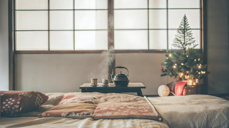 A steaming teapot and cups sit on a side table next to a bed with cozy blankets, near a small Christmas tree.