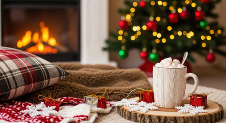 A warm and inviting Christmas scene featuring a mug of hot chocolate with marshmallows, a cozy blanket, and a crackling fireplace, creating a festive atmosphere.