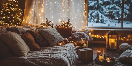 Cozy home Christmas background with blurred lights, tree ornaments, and soft blankets