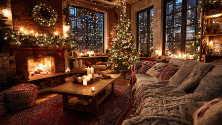 Festive living room scene with Christmas tree lights glowing, cozy blankets, and holiday decorations creating a joyful holiday ambiance.