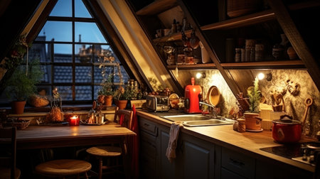 Interior of a rustic kitchen at night in the attic.