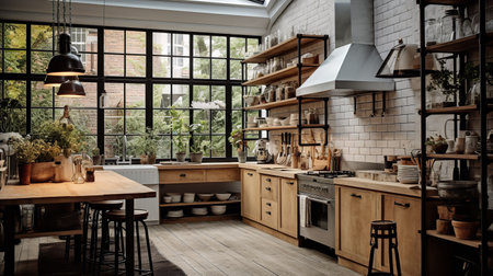 interior of a modern kitchen in a loft style with wooden furniture