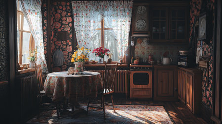 A cozy vintage kitchen bathed in warm light, featuring floral curtains, a round table set with flowers, and rustic wooden elements to create a peaceful atmosphere.