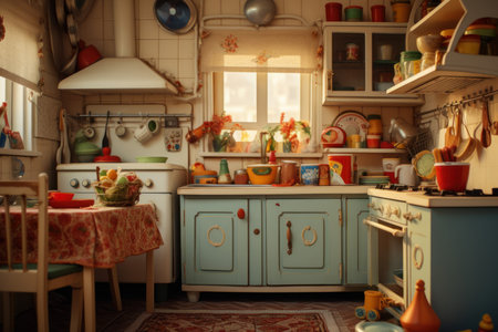 Cozy kitchen with retro decor and colorful utensils in sunlit room. That the image is generated using AI.