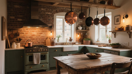 A cozy rustic kitchen features exposed brick walls, hanging copper pots, and charming green cabinetry. The kitchen is bathed in soft light, creating a warm and inviting atmosphere. A wooden table stands in the foreground, enhancing the rustic charm of the space. AI generated.