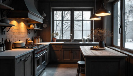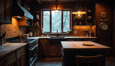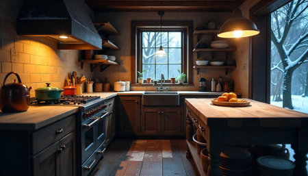 Cozy Rustic Kitchen Interior with Winter Window View