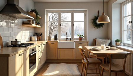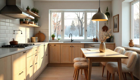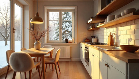 Cozy Kitchen Interior with Natural Light and Winter View