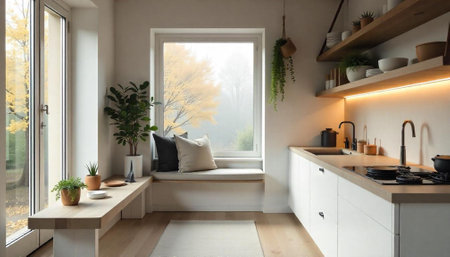 Modern kitchen interior with natural light and window seat