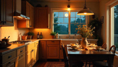 Cozy kitchen interior with warm lighting and elegant dinnerware