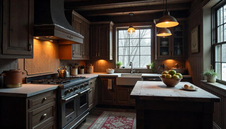 Warm rustic kitchen with natural light during winter season