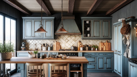 A beautifully designed rustic kitchen featuring blue cabinets and wooden accents. The warm lighting enhances the cozy atmosphere, perfect for cooking and dining.