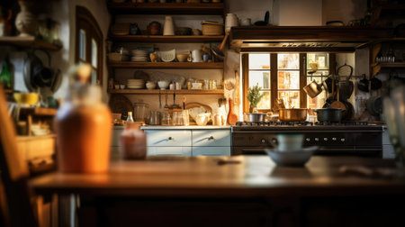 A blurred image of a farmhouse-style kitchen, a sense of depth and atmosphere. Generative AI
