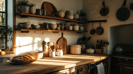 Cozy minimalist kitchen interior bathed in warm sunlight