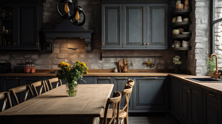 The modern interior design of country home kitchen chalet with wooden furniture. Generative AI AIG27.