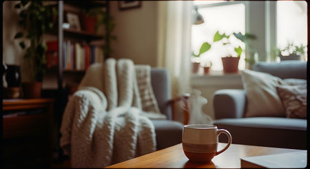 A serene living room scene featuring a beige couch with a knitted blanket, a wooden side table with a stack of books, a steaming white coffee cup, and a potted plant, bathed in warm sunlight.