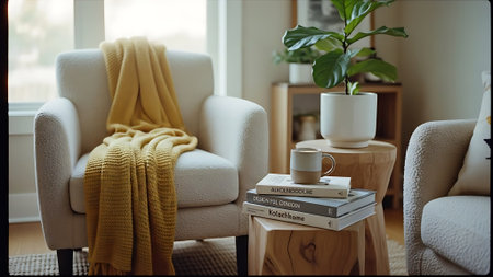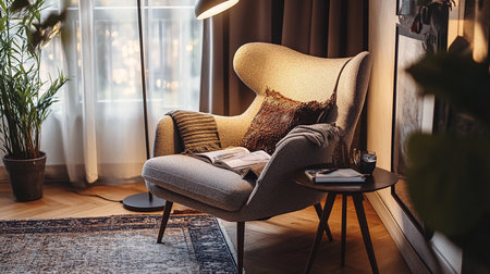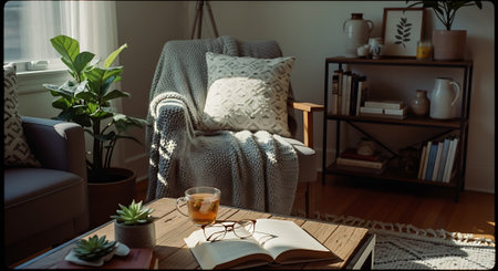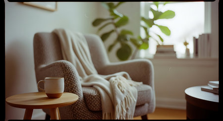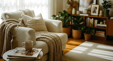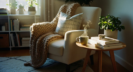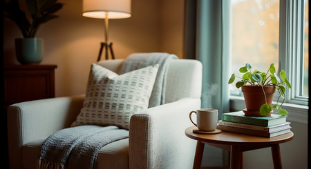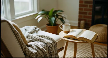 A serene living room scene featuring a comfortable armchair with a throw blanket, a wooden side table with books and a coffee cup, and a potted plant, all bathed in warm natural light.