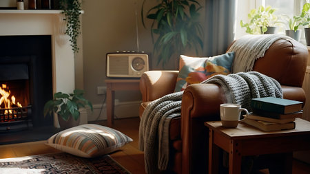 A cozy living room scene featuring a comfortable armchair draped with a knitted blanket, surrounded by decorative elements like candles, books, and plants, creating a warm and inviting atmosphere